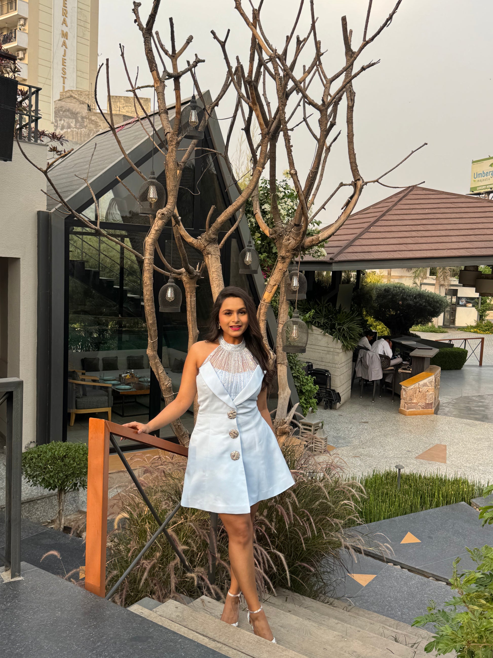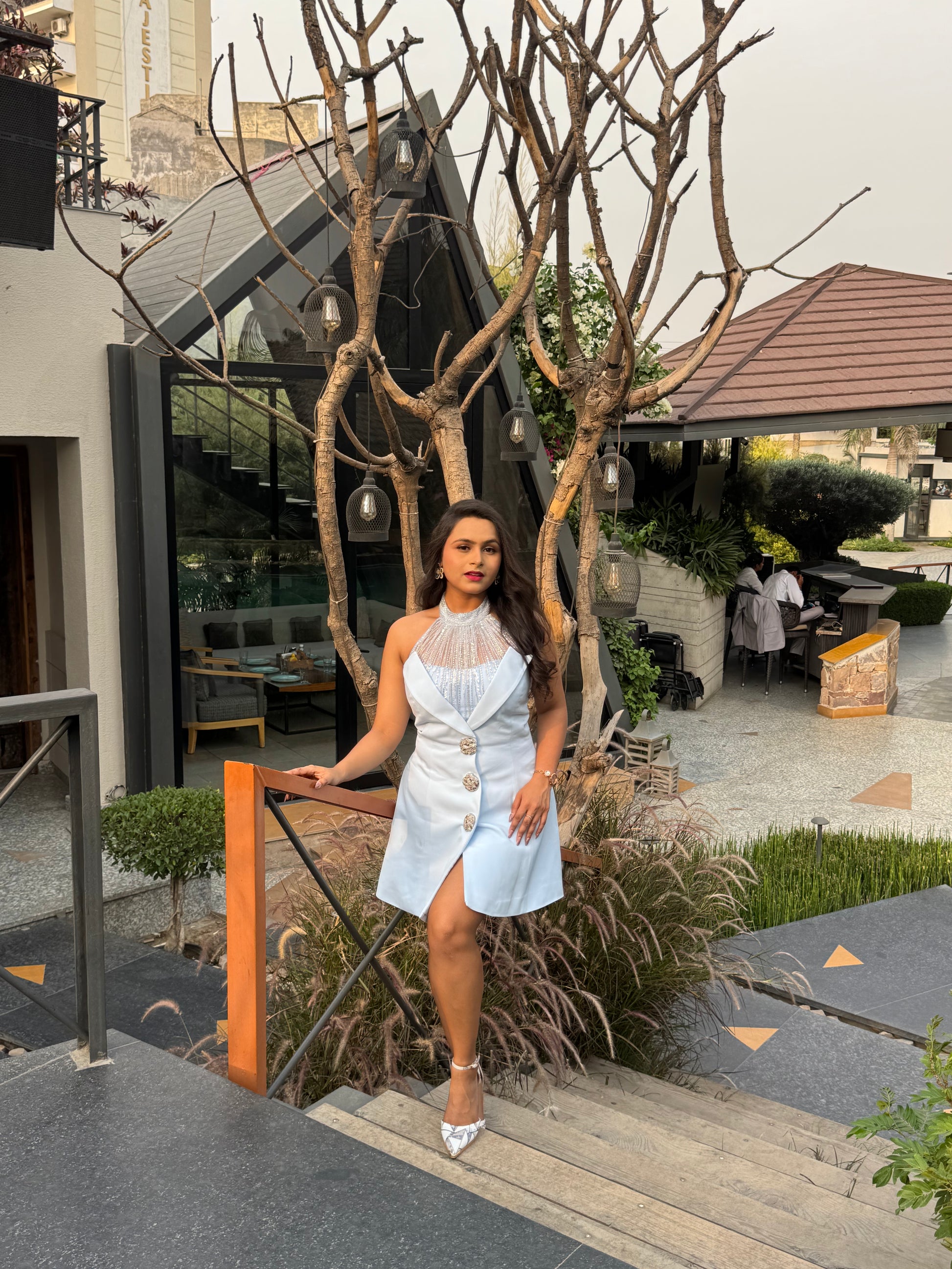 Exuding elegance with a commanding edge, Crystal Blazer features a structured blue mini dress that redefines power dressing. The blazer-inspired silhouette is cinched at the waist with ornate, oversized silver buttons that add a regal touch. The standout detail—a halter neckline adorned with cascading pearl beading—elevates the look with a sense of luxury and glamour. Paired with sparkling embellished heels, this outfit is a perfect harmony of sophistication and bold femininity, ideal for a resort soirée or an upscale brunch.