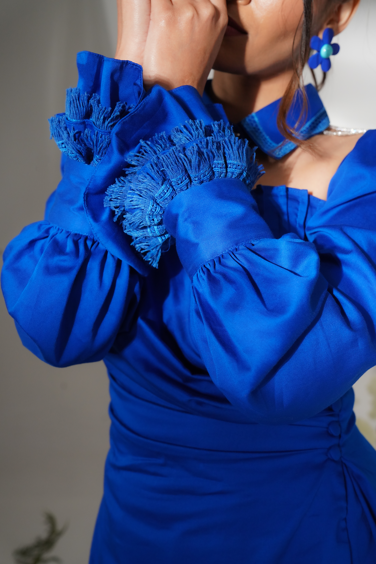 A bold and structured Lowes blue a tailored asymmetric Shirt featuring ruffle cuff and cut-out details, paired with matching shorts. The statement sleeves add a dramatic flair, making this outfit perfect for high-fashion events or evening parties.