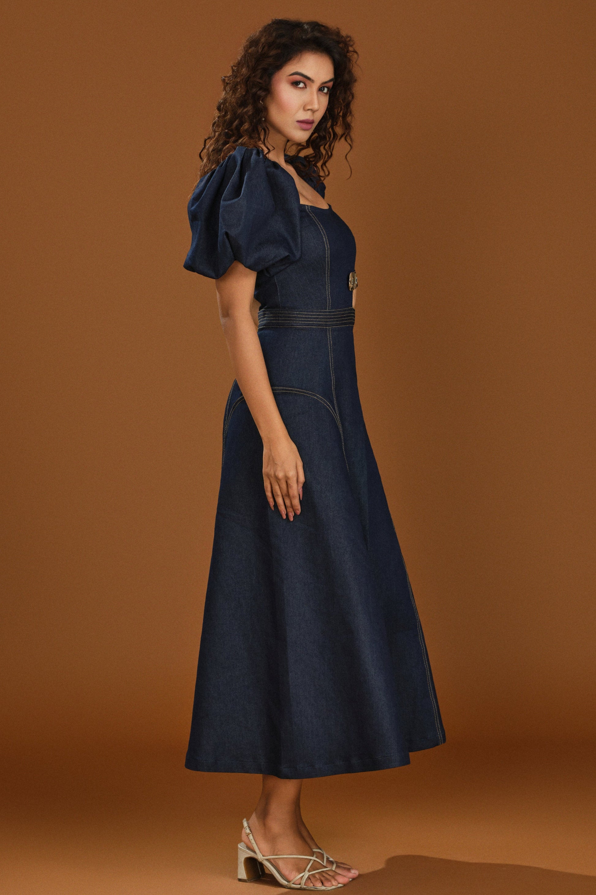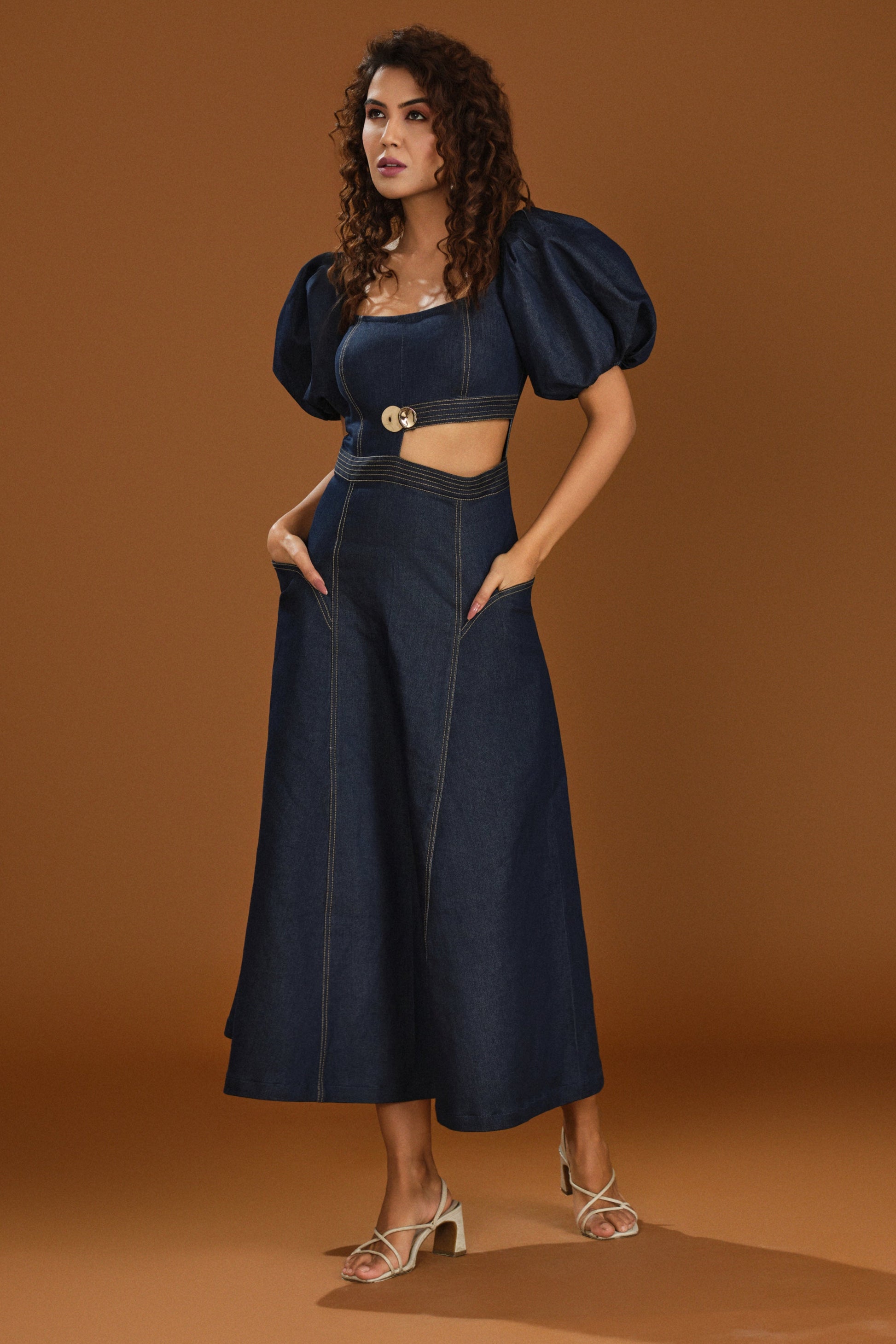 | The Puff and chic denim dress is where modern edge meets timeless denim. Designed with dramatic puff sleeves silhouette, this piece makes a bold fashion statement. The waist cut-out detail adds a touch of allure, perfectly balanced with structured tailoring. Finished with statement button accents at the waist, this outfit is effortlessly chic—ideal for turning heads at any occasion. |