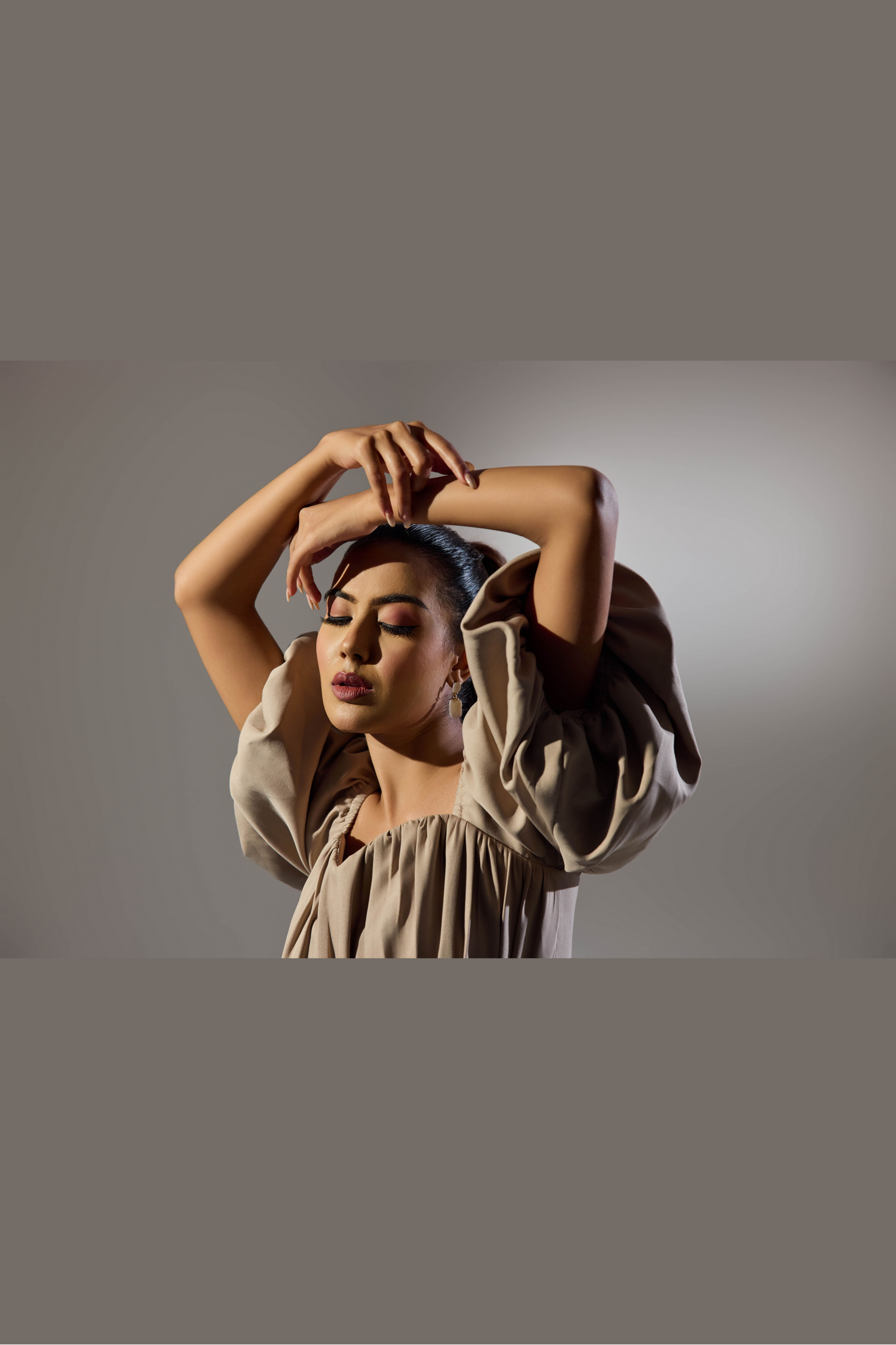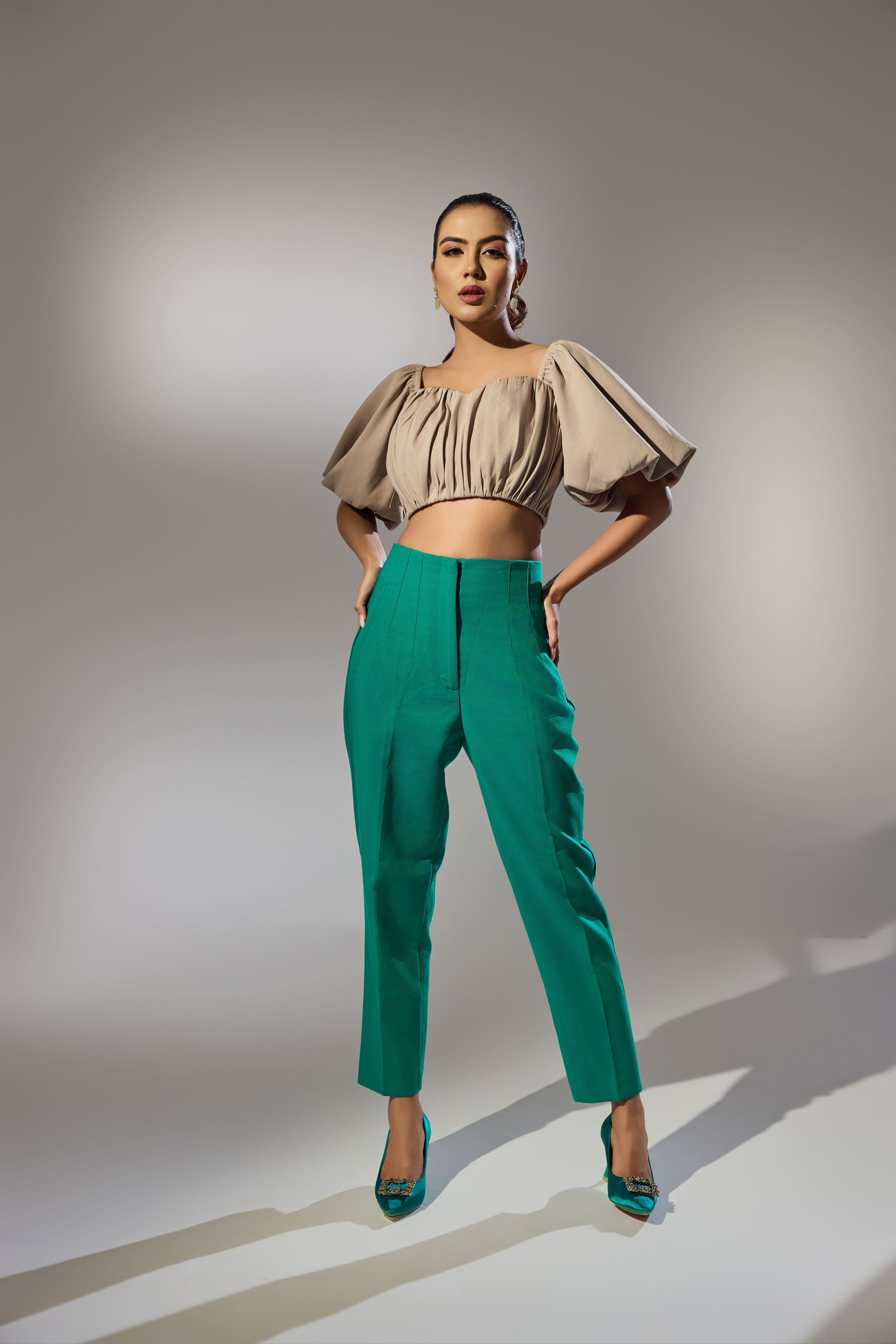 This outfit features a cropped top in a neutral beige tone with voluminous puffed sleeves. The neckline is gently ruched, creating a soft and feminine texture that complements the overall elegant design. The top is paired with what appears to be a contrasting bottom, possibly in a bold green shade, offering a modern and stylish combination. The outfit strikes a balance between playful and sophisticated, making it perfect for a chic, semi-formal occasion.