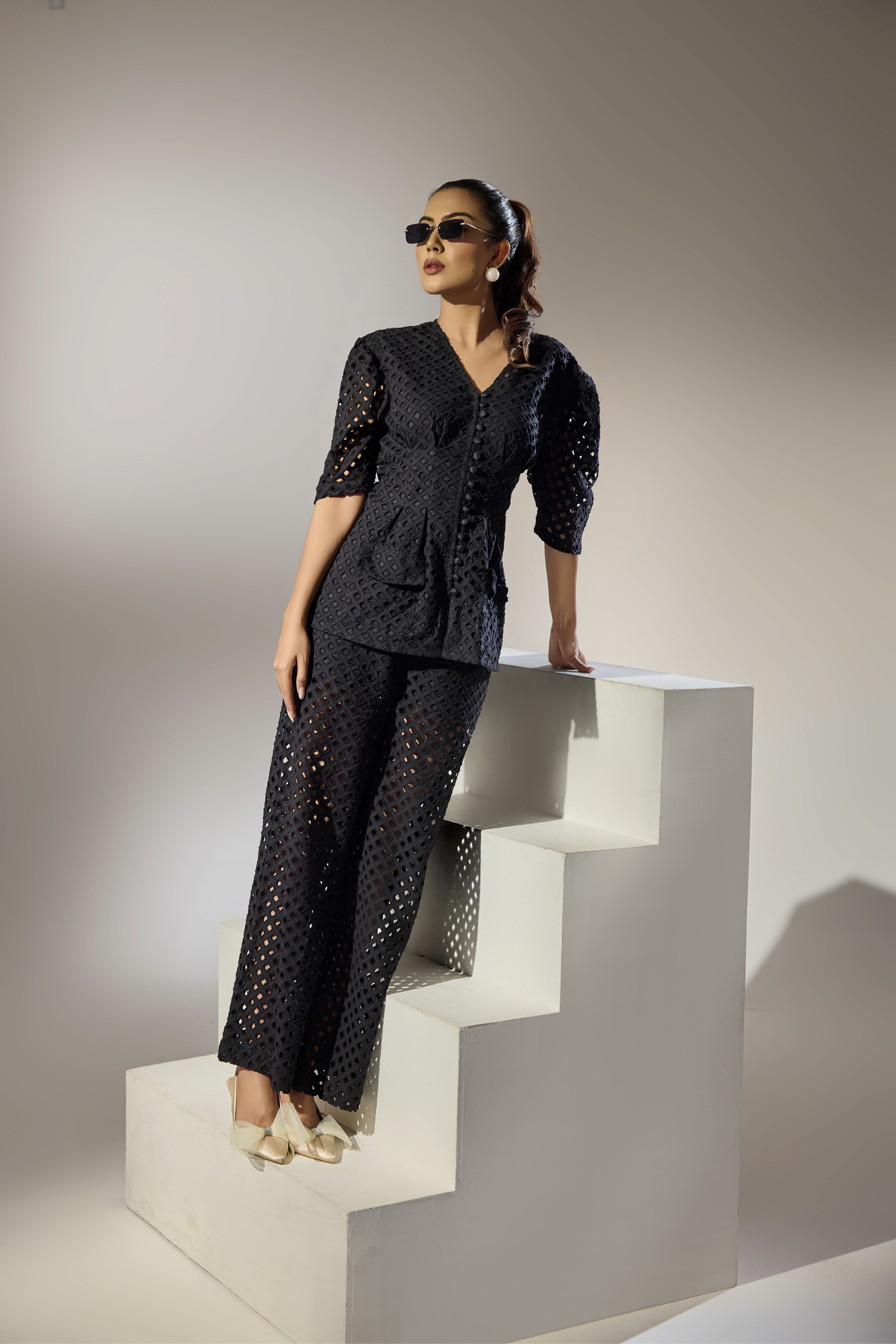 This outfit features a stylish black co-ord set crafted from an intricately designed eyelet fabric. The top has a tailored fit with a V-neckline and three-quarter sleeves, showcasing a sophisticated yet edgy vibe. The design includes subtle pleating or flap details around the waist, adding structure and dimension. The matching trousers are wide-legged and complement the top, with the sheer effect of the fabric lending a modern, breezy touch. The ensemble is completed with neutral-toned heels, creating a refined look perfect for contemporary formal or evening wear.